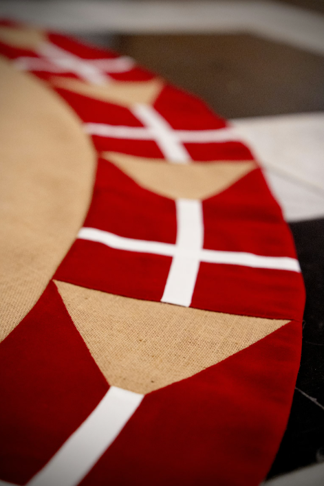 ”Tæppet omkring træets fod er designet af Hendes Majestæt Dronningen og viser en bort med Dannebrog som splitflag,” skriver kongehuset.